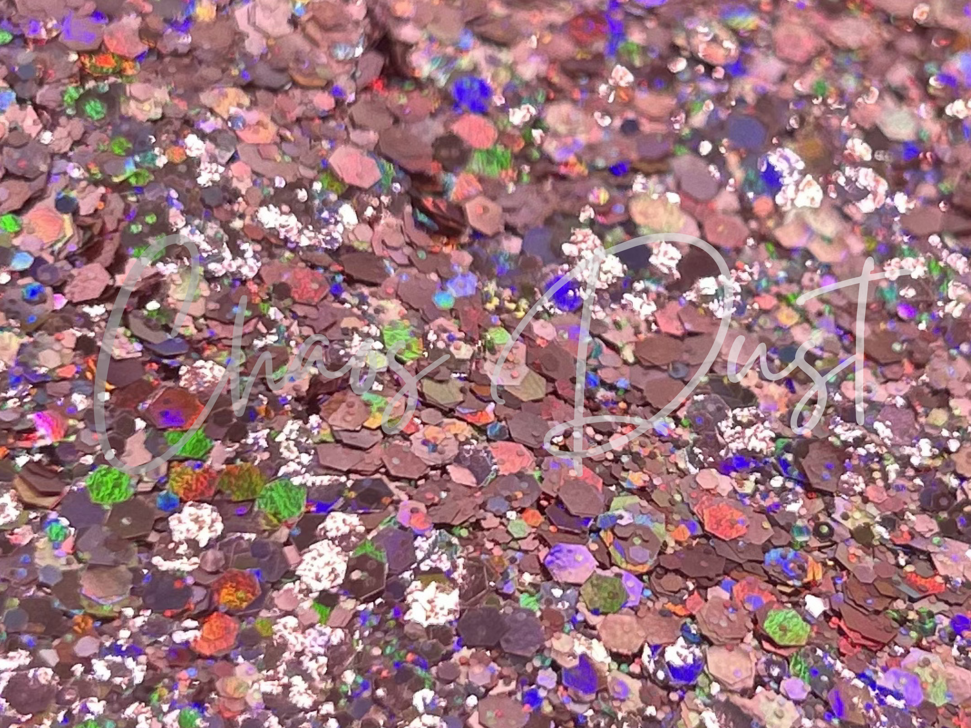 This glitter has a gorgeous dusty mauve base with bold holographic shifts—rich berry, lilac, green, and even flashes of gold. It’s earthy, glitzy, and multidimensional all at once.